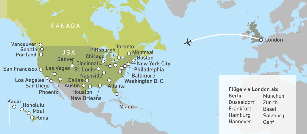 British Airways verbindet Berlin, Düsseldorf, Frankfurt, Hamburg, Hannover, Köln, München und Stuttgart via London Heathrow mit u.a. 28 Zielen in Nordamerika.