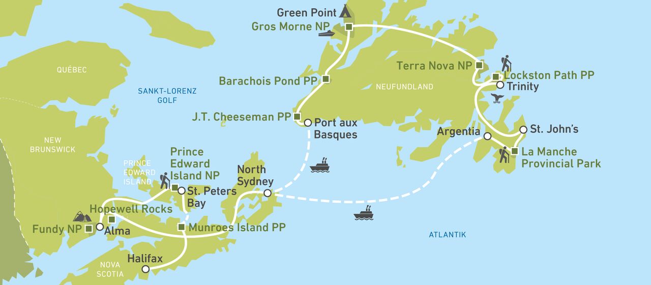 Den zweiten Teil unserer Elternzeit verbringen wir – Odette, Sebastian und der gerade neun Monate alte Piet – in Atlantik-Kanada. Eine Fähre bringt uns mit unserem Wohnmobil von Fraserway RV nach Neufundland. Wir wollen Wale beobachten und schöne Wanderungen unternehmen, vor allem im Gros Morne National Park. Auch New Brunswick liegt auf unserer Reise, dort lassen wir uns den Fundy National Park mit seinem riesigen Unterschied zwischen Ebbe und Flut nicht entgehen. Ebenso liegen die Hopewell Rocks genannten Gesteinsformationen auf dem Weg. Zum Abschluss lassen wir es uns auf Prince Edward Island gut gehen, wofür sich der Nationalpark und natürlich Wanderungen anbieten.