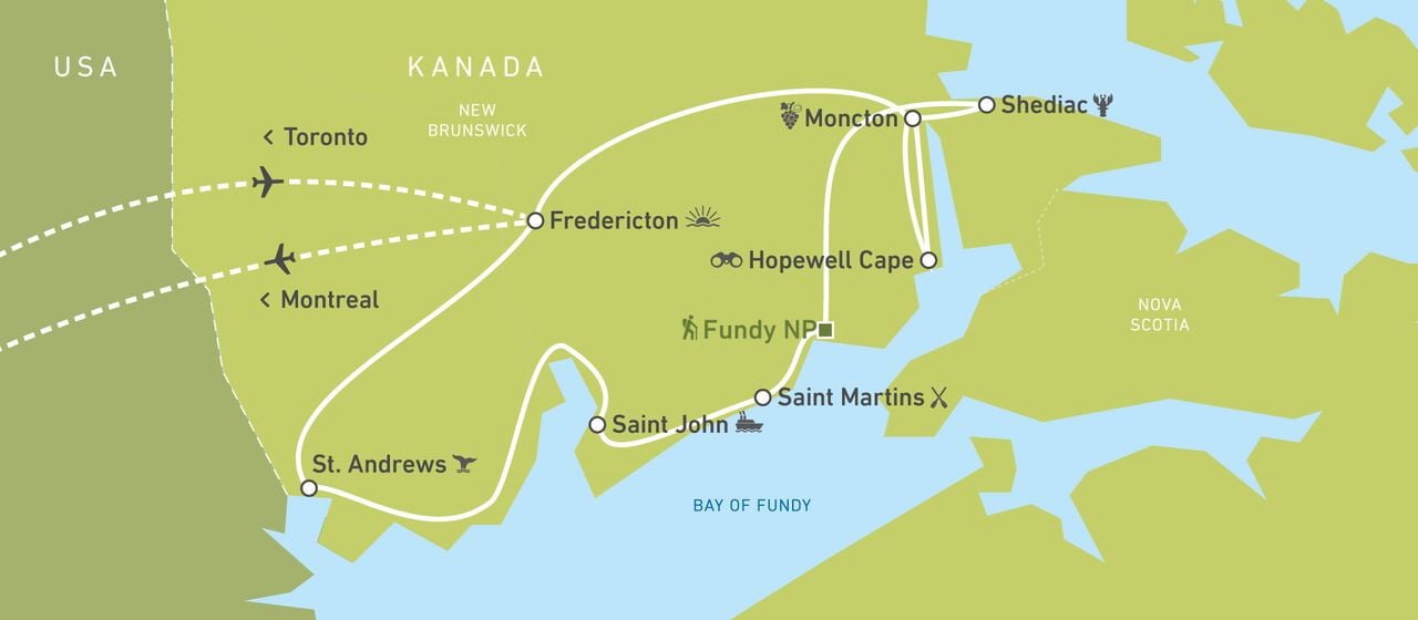 Danach mache ich mich auf zu einer kleinen Wanderung zu den Reversing Falls und dem Skywalk Saint John. Ein Wanderweg führt zu einem gläsernen Skywalk direkt über einem einmaligen Naturspektakel: An dieser Stelle trifft das Wasser des mächtigen, 700 Kilometer langen St. John River auf die Bay of Fundy. Zweimal am Tag steigt die Flut in der Bucht um knapp neun Meter und zwingt den Fluss, seine Fließrichtung umzukehren. Ein atemberaubendes Schauspiel, das man so schnell nicht wieder vergisst!