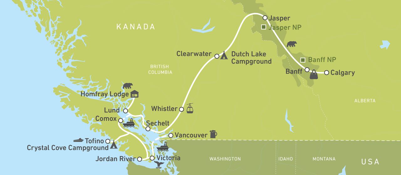 Zusammen mit Henry unternehmen wir beide eine dreiwöchige Campingtour durch Westkanada. Henry? So taufen wir unser Wohnmobil, mit dem wir uns von Calgary aus auf den Weg in die Rocky Mountains machen. Der Herbst hat besonders viel Abwechslung zu bieten: Banff und Jasper sind auch eingeschneit wunderschön, in Whistler geht es für uns ganz nach oben und danach an der Sunshine Coast in die Einsamkeit. Wir lassen Henry stehen, um von einer abgelegenen Lodge aus nach Walen und Bären Ausschau zu hallten. Dann geht die Fahrt auf Vancouver Island weiter und führt uns schließlich nach Vancouver, wo wir von Henry Abschied nehmen.