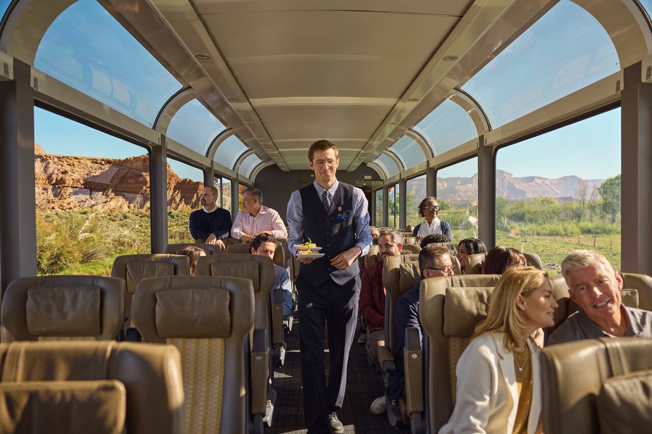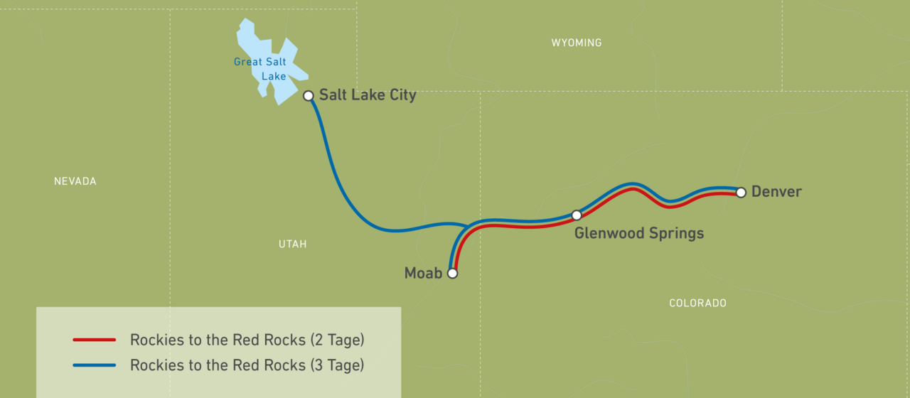 Die Bahnreise mit dem Canyon Spirit bietet spektakuläre Aussichten auf die imposanten Rocky Mountains und die ikonischen roten Felsformationen des amerikanischen Südwestens. Auf der Strecke Denver bis Moab – und in der längeren Variante weiter bis nach Salt Lake City – entfaltet sich eine Szenerie aus tiefen Schluchten, weiten Hochebenen und malerischen Flussläufen. Während Sie entspannt in Ihrem Sitz verweilen, gleitet die Landschaft durch großzügige Panoramafenster an Ihnen vorbei. Die Reise findet ausschließlich tagsüber statt – so entgeht Ihnen kein Abschnitt dieser außergewöhnlichen Route. Ergänzt wird das Erlebnis durch aufmerksamen Service, regionale Speisen und fachkundige Informationen. Je nach Reisevariante erleben Sie eine zwei- oder dreitägige Bahnreise – mit genügend Zeit, die Landschaft intensiv auf sich wirken zu lassen. Die Nächte verbringen Sie in ausgewählten, komfortablen Unterkünften.