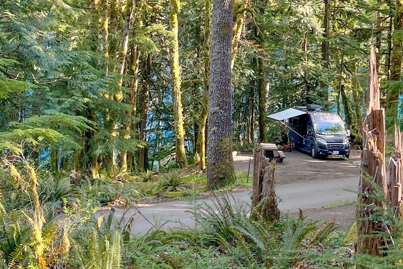 Der Fairholme Campground liegt malerisch am Ufer des Lake Crescent in Washington und bietet 87 Stellplätze für Zelte und Wohnmobile. Umgeben von üppigen Wäldern und türkisblauem Wasser ist er ideal für Naturfreunde und Fans von Outdoor-Aktivitäten wie Wandern, Schwimmen oder Bootfahren. Der preiswerte Campingplatz verfügt über grundlegende Sanitäreinrichtungen wie Toiletten und Trinkwasser, jedoch keine Duschen oder Wasser-oder Stromanschlüsse, dafür viele Stellplätze mit direktem Seeblick und einen kleinem General-Store, bei dem man neben Lebensmitteln auch Feuerholz kaufen kann. Eine Möglichkeit um das Trinkwasser des Campers aufzufüllen und um Abwasser zu entleeren sind ebenfalls vorhanden. In der Hochsaison empfiehlt sich unbedingt eine Reservierung.