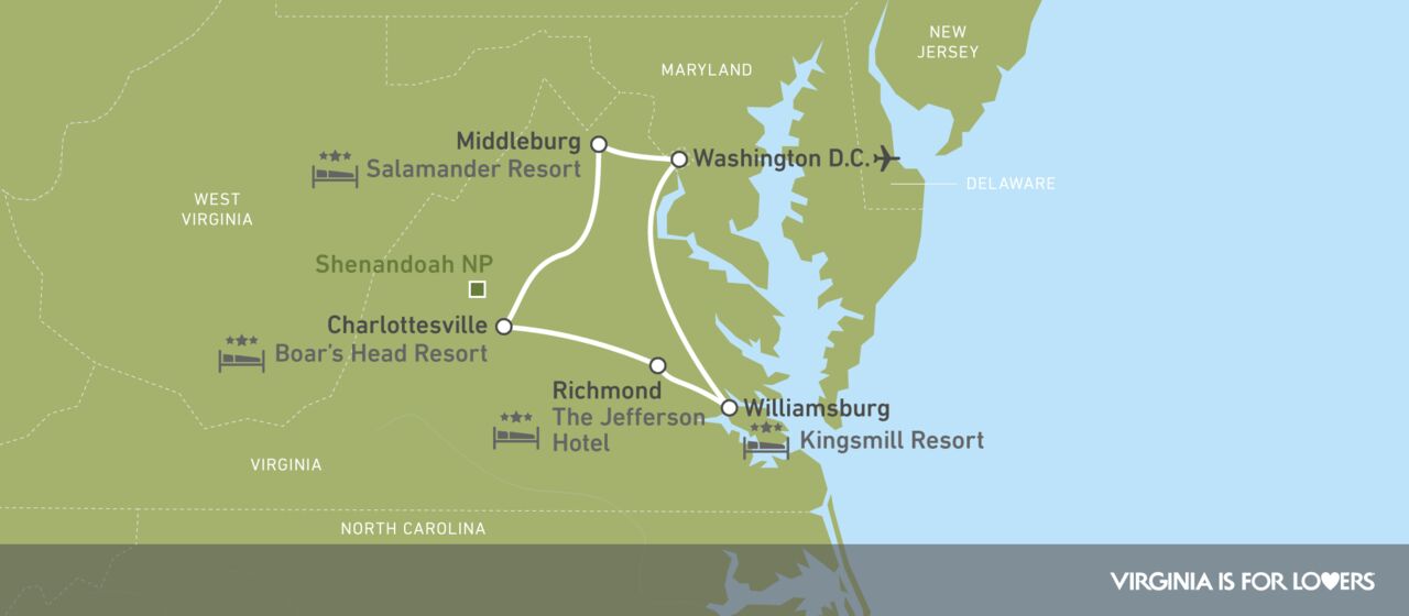 Prächtige Resorts, erstklassige Golfplätze und erholsame Spas sowie exquisite Restaurants vereint in einer wunderbaren Route durch Virginia. Während der einwöchigen, rund 360 Kilometer langen Reise gibt es viele Höhepunkte zu erleben: atemberaubende Natur im Shenandoah National Park, die Geschichte im kolonialen Williamsburg und natürlich Luxus pur in den wunderschönen Resorts, darunter das Salamander Resort und das Jefferson Hotel.