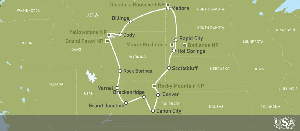 Ob Fossilien im Dinosaur National Monument, Wildpferde in Rock Springs oder Bisons und wasserspeiende Geysire im Yellowstone National Park – Naturliebhaber und Outdoor-Enthusiasten haben auf dieser etwa 3.700 Kilometer langen Reiseroute durch die Rocky Mountains und die Great Plains viel zu entdecken. Zudem lernen Sie auf diesem dreiwöchigen Roadtrip in Orten wie Cody und Cheyenne den außergewöhnlichen Charme des Wilden Westens kennen. Von Mai bis September herrschen in dieser Region meist angenehme Temperaturen, sodass sich eine Reise besonders anbietet.
