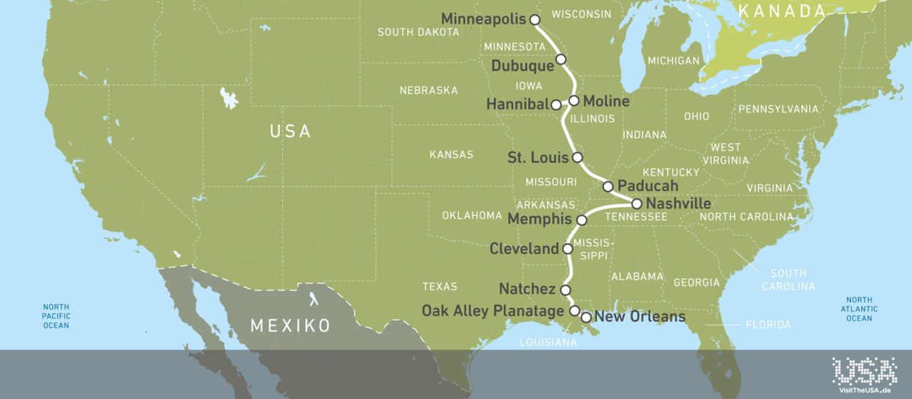 Fans von melodischen Rhythmen und guter Musik sind auf dieser 15-tägigen Reise von Minneapolis nach New Orleans genau richtig. Unterwegs treffen Sie immer wieder auf den mächtigen Mississippi River, der sich wunderbar in die herrliche Landschaft schmiegt. Besuchen Sie Musikmetropolen wie Nashville und Memphis und wandeln auf den Spuren berühmter Künstler wie Robert Johnson – auf dieser etwa 2700 Kilometer langen Route von den Great Lakes im Norden der USA bis an den Golf von Mexiko im Süden entdecken Sie die vielfältige Musikkultur der Vereinigten Staaten.