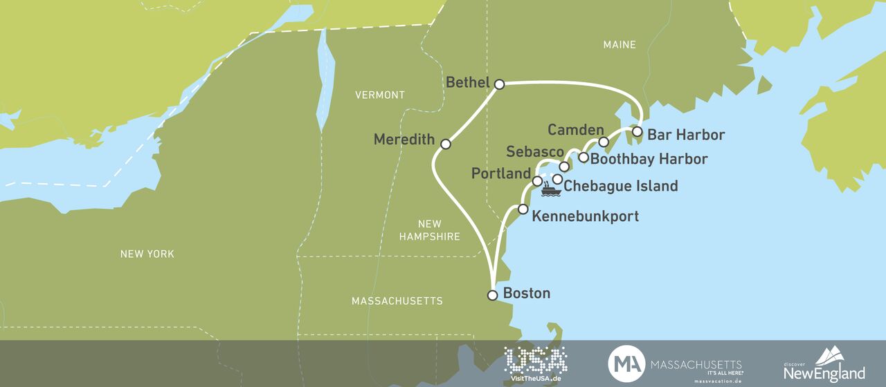 Auf dieser 15-tägigen Route entdecken Sie die Höhepunkte der Neuenglandstaaten Massachusetts, Maine und New Hampshire. Die rund 1.200 Kilometer lange Strecke beginnt an der malerischen Küste, wo Sie charmante Orte mit Neuengland-Flair erwarten, und führt Sie an schöne Strände, historische Leuchttürme und durch herrliche Landschaften, etwa im Acadia National Park oder in Meredith. Geschichtsinteressierte sind in Boston und Portland genau richtig. Die beste Reisezeit für einen Roadtrip durch Neuengland sind die Monate Mai bis Oktober. Besonders empfehlenswert ist der farbenfrohe Indian Summer im Herbst.