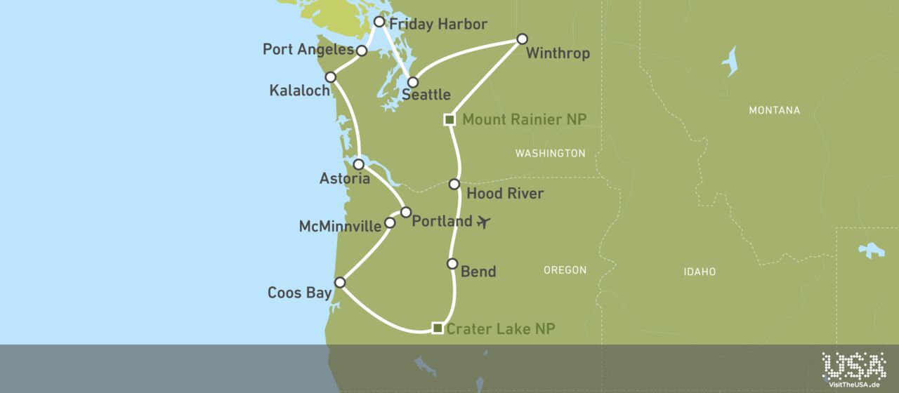 Der Pazifische Nordwesten heißt Sie mit zahlreichen Höhepunkten willkommen, die Sie auf dieser 17-tägigen Reiseroute hautnah erleben werden. Lernen Sie die trendigen Metropolen Portland und Seattle kennen, wandern Sie durch den ursprünglichen Regenwald im Olympic National Park und bewundern Sie die wilden Küsten in Kalaloch und in Coos Bay. Auf dieser 3.100 Kilometer langen Strecke wird Sie die von Vulkanismus geprägte Kaskadenkette mit dem eindrucksvollen Mount Rainier ins Staunen versetzen, Sie genießen das entspannte Inselleben auf San Juan Island und probieren köstliche Weine im Willamette Valley. Die beste Reisezeit für eine Tour durch den Nordwesten der USA sind die Monate Mai bis Oktober.
