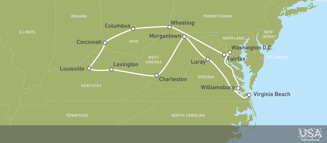 Lassen Sie sich in 15 Tagen von der US-Hauptstadt Washington D.C. sowie von den Bundesstaaten Virginia, West Virginia, Kentucky und Ohio begeistern. Die etwa 2.800 Kilometer lange Strecke hält einige Höhepunkte bereit, die von bewegender Geschichte in Williamsburg und Wheeling über spannende Outdoor-Aktivitäten in Luray und Morgantown bis hin zu Sportveranstaltungen in Cincinnati und herrlichen Strandtagen in Virginia Beach reichen. Die beste Reisezeit für diese Route ist von Mai bis Oktober, aber auch in der Nebensaison sind diese Regionen und Städte eine Reise wert.