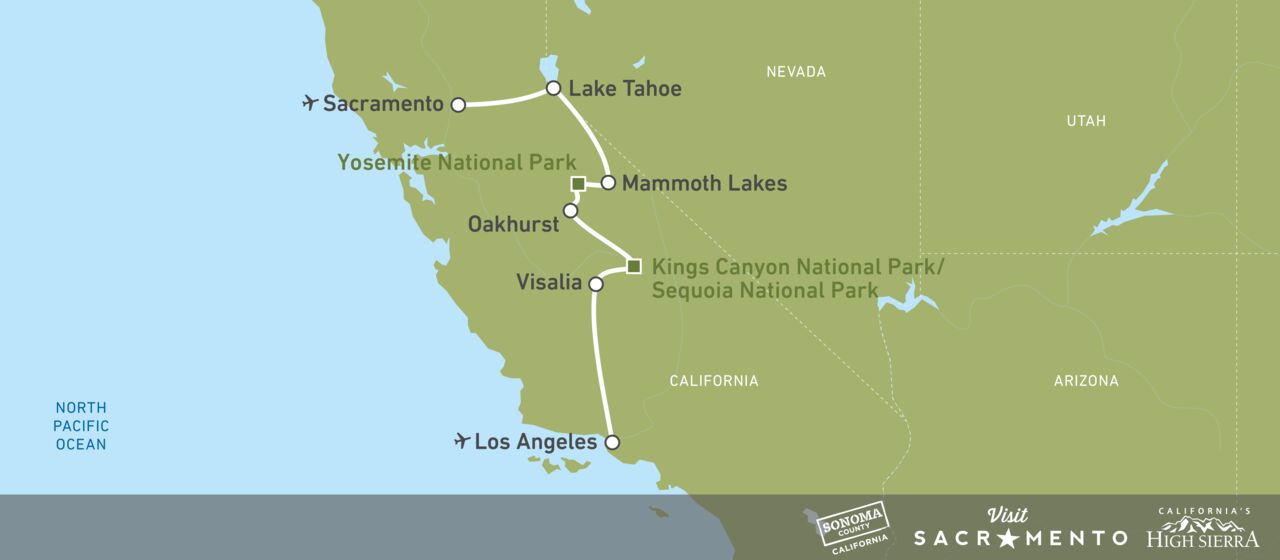 Dieser Routenvorschlag führt Sie in zwei Wochen durch das wunderschöne, vielseitige Kalifornien. Lassen Sie sich auf der rund 1.200 Kilometer langen Rundreise von der spektakulären Natur im Yosemite, im Kings Canyon und im Sequoia National Park mitreißen. Erleben Sie auch den Trubel einer Großstadt wie Los Angeles. Die beste Reisezeit dafür ist von März bis Oktober.