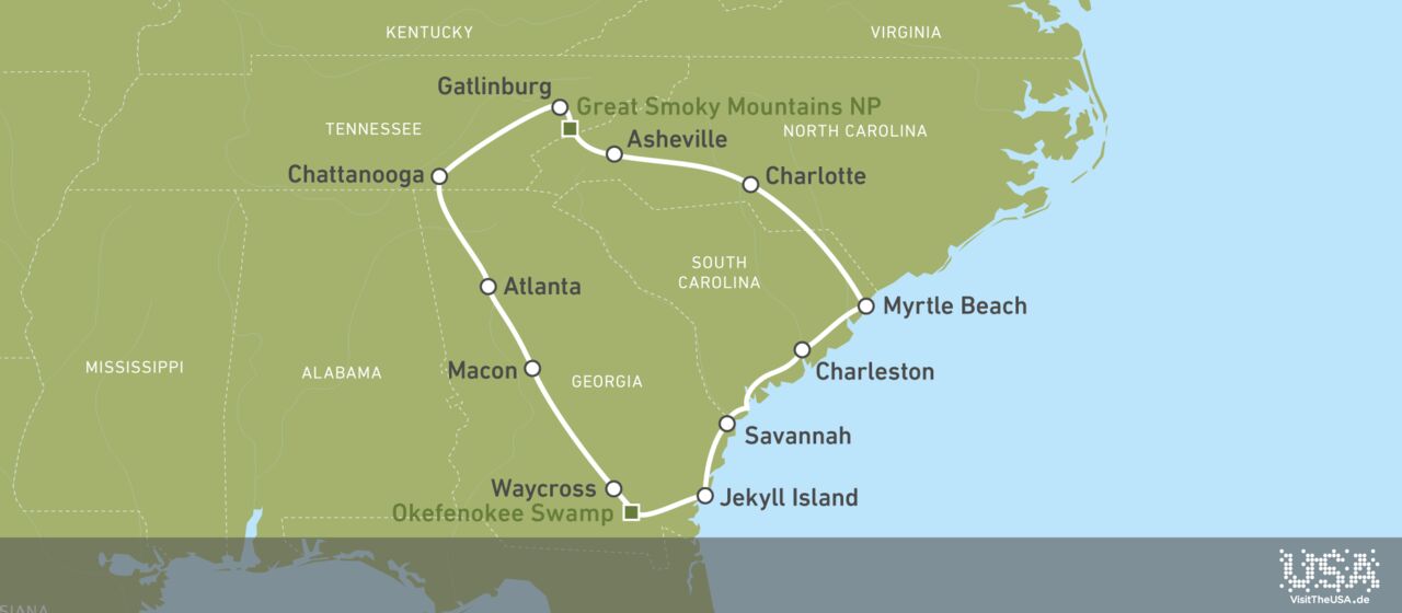 Auf dieser großartigen Reiseroute erleben Sie in 15 Tagen Geschichte hautnah in Atlanta, Charleston und Macon, erfreuen sich an bildschönen Landschaften im Great Smoky Mountains National Park sowie im Okefenokee Swamp und erholen sich an den Stränden von Myrtle Beach und Jekyll Island. Etwa 2.000 Kilometer führt Sie dieser spannende Roadtrip durch Georgia, Tennessee, North und South Carolina – lassen Sie sich von unserer Route durch die Südstaaten inspirieren!