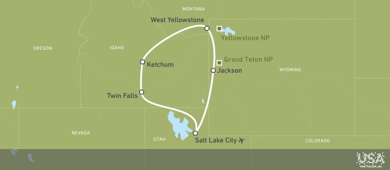 Folgen Sie dieser etwa 1.600 Kilometer langen Route durch die vielseitigen US-Bundesstaaten Utah, Wyoming, Montana und Idaho, und kommen Sie den Naturwundern des Yellowstone National Park und des Grand Teton National Park abseits der klassischen Pfade ganz nah. Auf dieser 11-tägigen Reise erwarten Sie neben spektakulären Landschaften und abwechslungsreichen Outdoor-Aktivitäten auch beschauliche kleine Orte wie Jackson und Ketchum sowie die geschichtsträchtige Metropole Salt Lake City. Diese Region lässt sich am besten zwischen Mai und September bereisen.