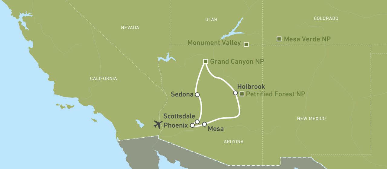Mit unserem abwechslungsreichen Routenvorschlag erleben Sie in neun Tagen die Höhepunkte des faszinierenden US-Bundesstaates Arizona. Bewundern Sie auf der rund 1.000 Kilometer langen Strecke einzigartige Naturwunder wie den Grand Canyon National Park und den Petrified Forest National Park, genießen bei einer spannenden Jeep Tour den herrlichen Anblick der roten Wüstenlandschaft rund um Sedona und runden Ihre Reise mit dem großen Kulturangebot von Phoenix, Scottsdale und Mesa ab. Am besten besuchen Sie Arizona im Frühjahr oder im Herbst, wenn die Temperaturen angenehm warm sind.