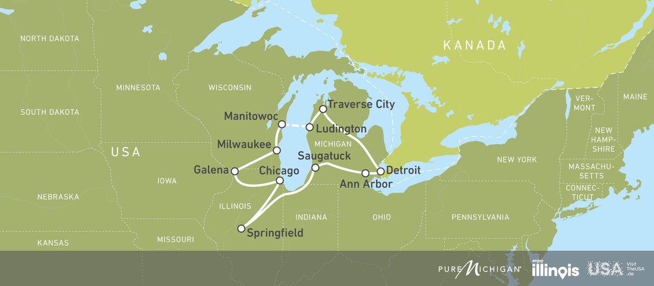 Lernen Sie auf dieser 2-wöchigen Route charmante Städte und faszinierende Orte in Michigan und Illinois kennen. Rund 2.400 Kilometer liegen vor Ihnen: Abwechslungsreiche Kultur erwartet Sie in Städten wie Detroit und Chicago, entlang der legendären Route 66 kommt ein Gefühl von Nostalgie auf, und rund um Galena wartet die wunderschöne Natur darauf, von Ihnen entdeckt zu werden. Erholen Sie sich zwischendurch an den Sandstränden von Saugatuck sowie Traverse City, und ein Besuch in Springfield versetzt Sie zurück in die Zeit von Abraham Lincoln. Diesen Roadtrip durch Michigan und Illinois unternimmt man am besten im Sommer, aber auch im Frühling und Herbst haben die Regionen ihren Reiz.