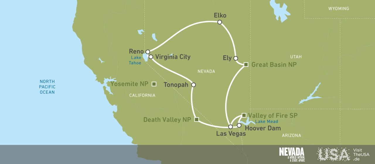 Auf dieser spannenden Reise lernen Sie in zwei Wochen die spektakulärsten Orte kennen, die Nevada zu bieten hat. Entdecken Sie auf den rund 2.000 Kilometern zahlreiche Highlights, darunter Las Vegas, Reno und der Lake Tahoe. Eine Nevada Reise ist das ganze Jahr über möglich. Die beste Reisezeit ist im Frühling und im Herbst. Wärmer wird es im Sommer, wenn die Temperaturen oftmals auf über 40 Grad steigen. Der Winter verwandelt die Landschaft dagegen in ein Winterwunderland – besonders der Lake Tahoe ist dann ein beliebtes Ziel für Skireisen.