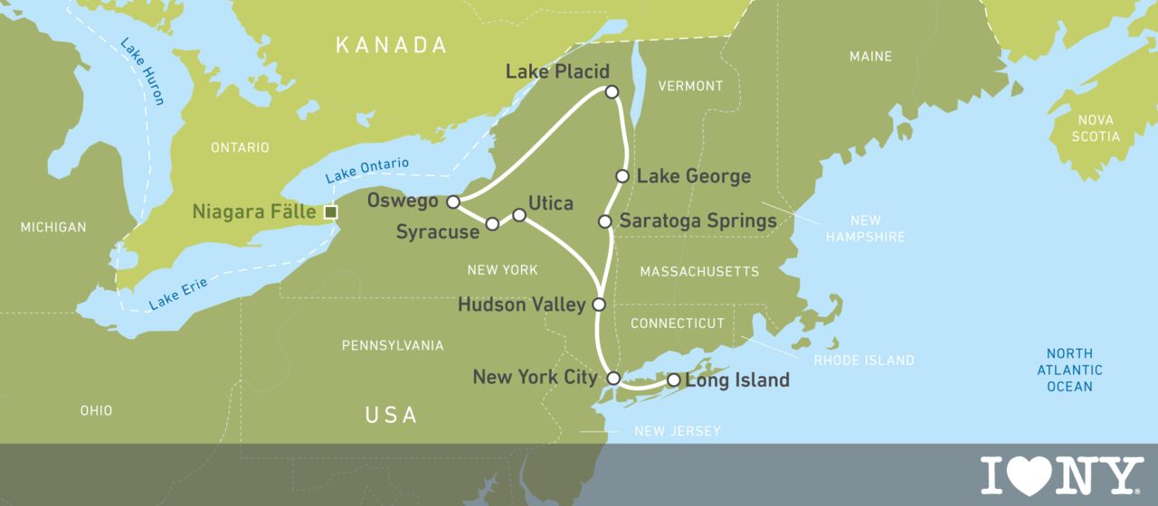 Folgen Sie dieser rund 1.500 Kilometer langen Route durch den abwechslungsreichen US-Bundesstaat New York. Zu den Höhepunkten zählen die lebhafte Metropole New York City mit all ihren berühmten Sehenswürdigkeiten und die endlosen Sandstrände von Long Island sowie die wunderschönen Naturlandschaften der Adirondack Mountains und des Hudson Valley. Auf dieser zweiwöchigen Reise besuchen Sie zudem die Städte Syracuse und Utica, werfen einen Blick auf die Great Lakes und shoppen in den Einkaufszentren Destiny USA und Woodbury Common Premium Outlets. Die besten Reisezeiten für den New York State sind das Frühjahr und der Herbst. Letzterer begeistert besonders durch die bunte Farbenpracht der Blätter im Indian Summer.