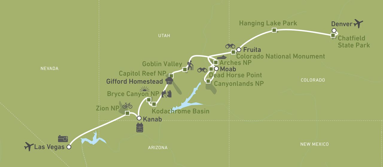 Zwölf Reisebegeisterte von CANUSA sind unterwegs mit fünf Wohnmobilen von Road Bear RV und erkunden die großartige Natur zwischen Denver und Las Vegas. Die Bundesstaaten Colorado und Utah sind genau richtig, um riesige Berge, faszinierende Ausblicke und Felsen in den verschiedensten Farben zu sehen. Die Reise geht ebenso zum Canyonlands National Park wie auch zum Goblin Valley State Park, zum Bryce Canyon und zum Zion National Park. Nebenbei erfährt man, warum einer der Nationalparks so heißt wie das Unternehmen Kodak und welche Farben ein Sonnenaufgang auf die Hoodoos zaubert. Ein wahrer Kontrast zu den Tagen inmitten der Natur ist das Ziel der Reise: Las Vegas.
