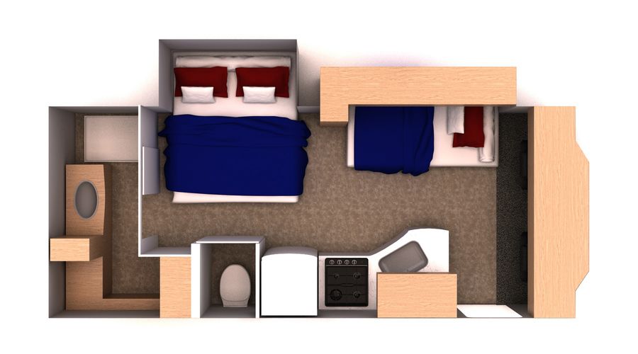 Mit 1 oder 2 Slide-Outs und einem festen Queen-Size-Bett bietet der Super Van Camper genug Platz. Der abgebildete Grundriss sowie die Ausstattung und Maße des Fahrzeugs dienen als Referenz und können auf Grund von unterschiedlichen Baujahren und Modellen abweichen.