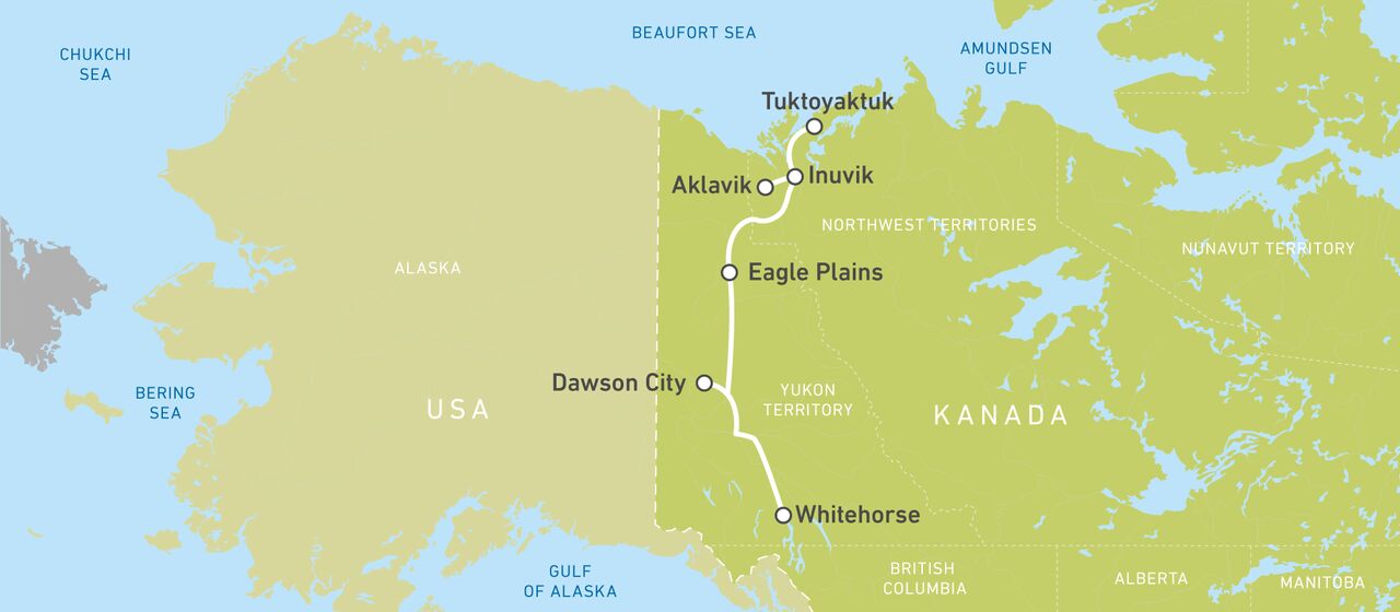 Eine Reise vom Pazifik bis zum arktischen Meer erwartet Sie, entlang schneebedeckter Wege und Straßen aus Eis, die den ursprünglichen Lebensräumen der Tierwelt und traditionellen Handelswegen der Ureinwohner folgen - später wurden diese von Goldgräbern und Mounties benutzt.