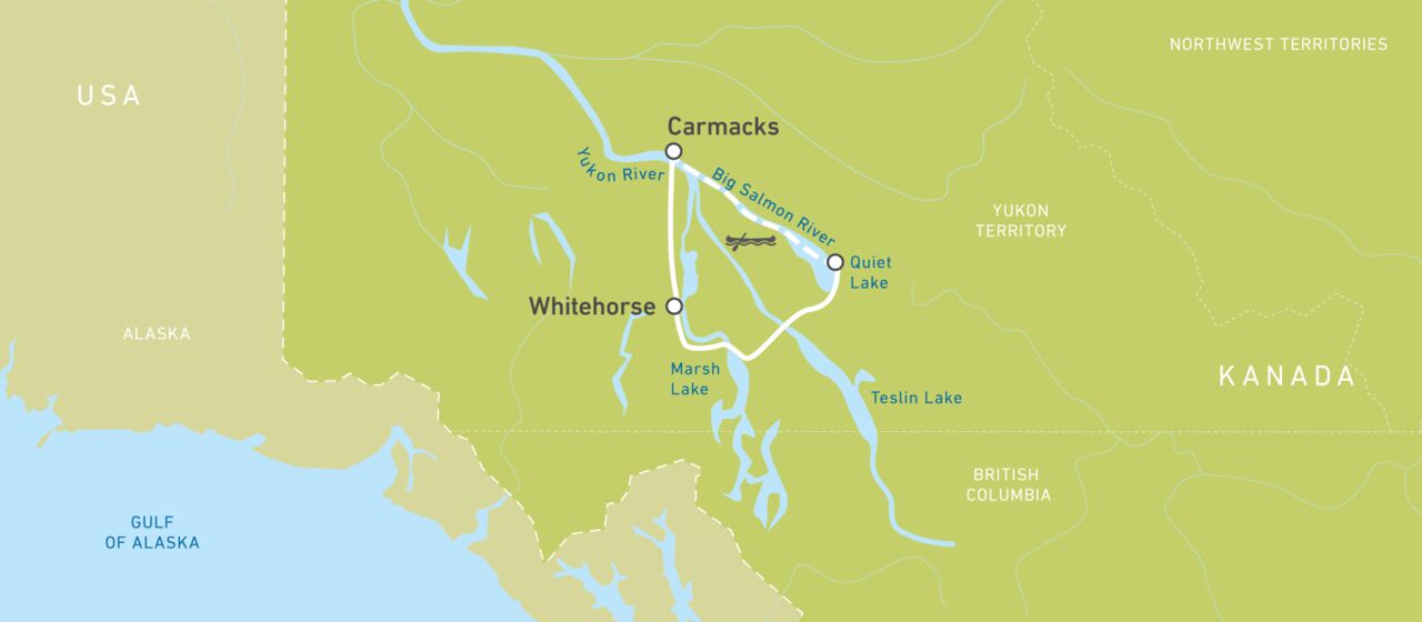 Der Klondiker – Big Salmon RiverDieser technisch nicht anspruchsvolle Kanutrip durch die beeindruckende Bergwelt des südlichen Yukon ist eine der beliebtesten Kanutouren und bei Anfängern wie Fortgeschrittenen gleichermaßen geschätzt. Sie folgen, weitab von jeglicher Zivilisation, dem alten Trail der Trapper und Goldsucher und Ihr Reiseleiter vermittelt Ihnen den Umgang in leichtem Wildwasser (bis Klasse 2). Sie lernen viele nützliche Dinge über das Leben im Busch, die Orientierung im Gelände, das Anlegen von Camps und über die Nahrungssuche. Knapp 13 Tage verbringen Sie auf dem Big Salmon und später dem Yukon River und legen etwa 350 Kilometer im Kanu zurück. Sie führen ein Leben in völligem Einklang mit der Natur, durchstreifen den Busch und die Berge und erleben die Schönheiten und Herausforderungen des Landes. Grizzlys, Elche, Wölfe und Adler werden Sie, die den Fluss aufsteigenden Lachse, mit etwas Glück zu unseren Begleitern gehören.