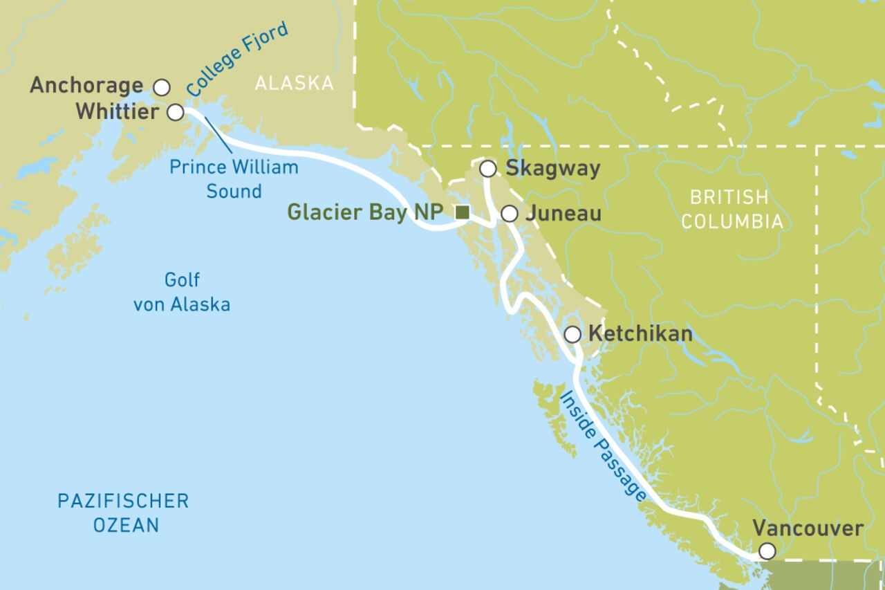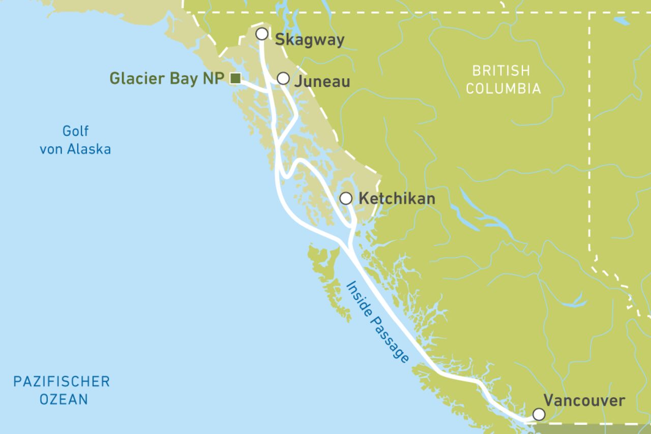Nur in wenigen Gebieten treffen Land und Meer so beeindruckend aufeinander wie in Alaska, weshalb es kaum eine schönere Gegend für eine Kreuzfahrt gibt. Sie werden Orte anlaufen, die nur mit dem Schiff oder per Flugzeug erreichbar sind – wie etwa die Hauptstadt Juneau. In den Hafen einzulaufen und den erste Blick auf eine Küstenstadt vom Meer aus zu genießen, das ist etwas ganz Besonderes. Vancouver ist der perfekte Start- oder Zielhafen für eine Alaska-Kreuzfahrt. Idealerweise kombinieren Sie diese mit einer Auto- oder Wohnmobilrundreise durch Westkanada. Bei einer Fahrt bis Anchorage können Sie direkt danach noch weitere Höhepunkte Alaskas kennenlernen, etwa den Denali National Park. Auch eine Zugfahrt mit der Alaska Railroad von Seward bis Fairbanks ist eine sehr gute Ergänzung.